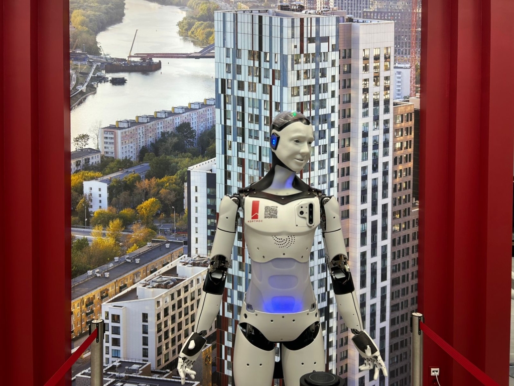 На стенде также были представлены образцы фасадных солнечных панелей, для продвижения которых девелопер совместно с “Хевел” создали компанию “Зеленый город”. Посетителей встречал робот-консьерж Арди